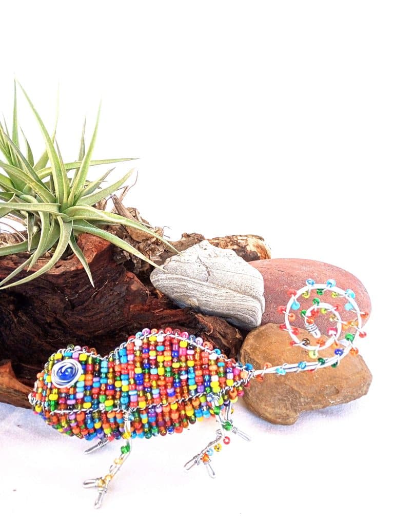 Looking for a fun and quirky gift for a loved one? Our handcrafted beaded chameleon is the perfect choice. With its bright colors and intricate beadwork, this little guy is sure to be a hit with chameleon lovers and art enthusiasts alike. Bring a touch of the exotic into your home with this charming piece of decor.